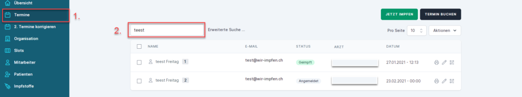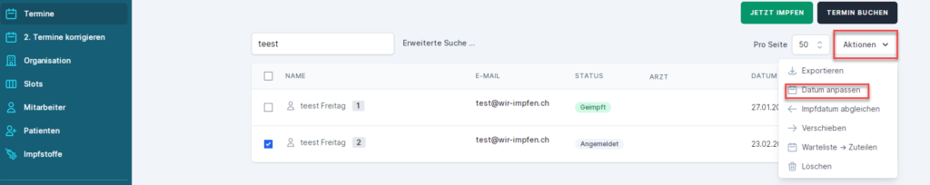Um die Eingaben zu überprüfen, im Suchfeld den Namen des Patienten wieder eingeben . Wenn Sie einen einzelnen Termin verschieben, dann erhält der Patient die Änderungen per Email und Sie müssen ihn nicht weiter informieren. Es kann auch bei den geimpften Terminen das Datum angepasst werden.