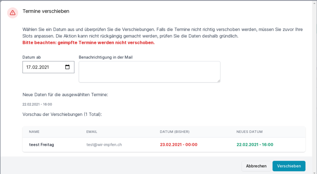 Verschieben: Mit der zweiten Option „Verschieben“ bietet Ihnen die Plattform selber Termine an. Mit dieser Option können Sie aber keine Termine verschieben, bei denen das Impfdatum bereits vorüber ist.